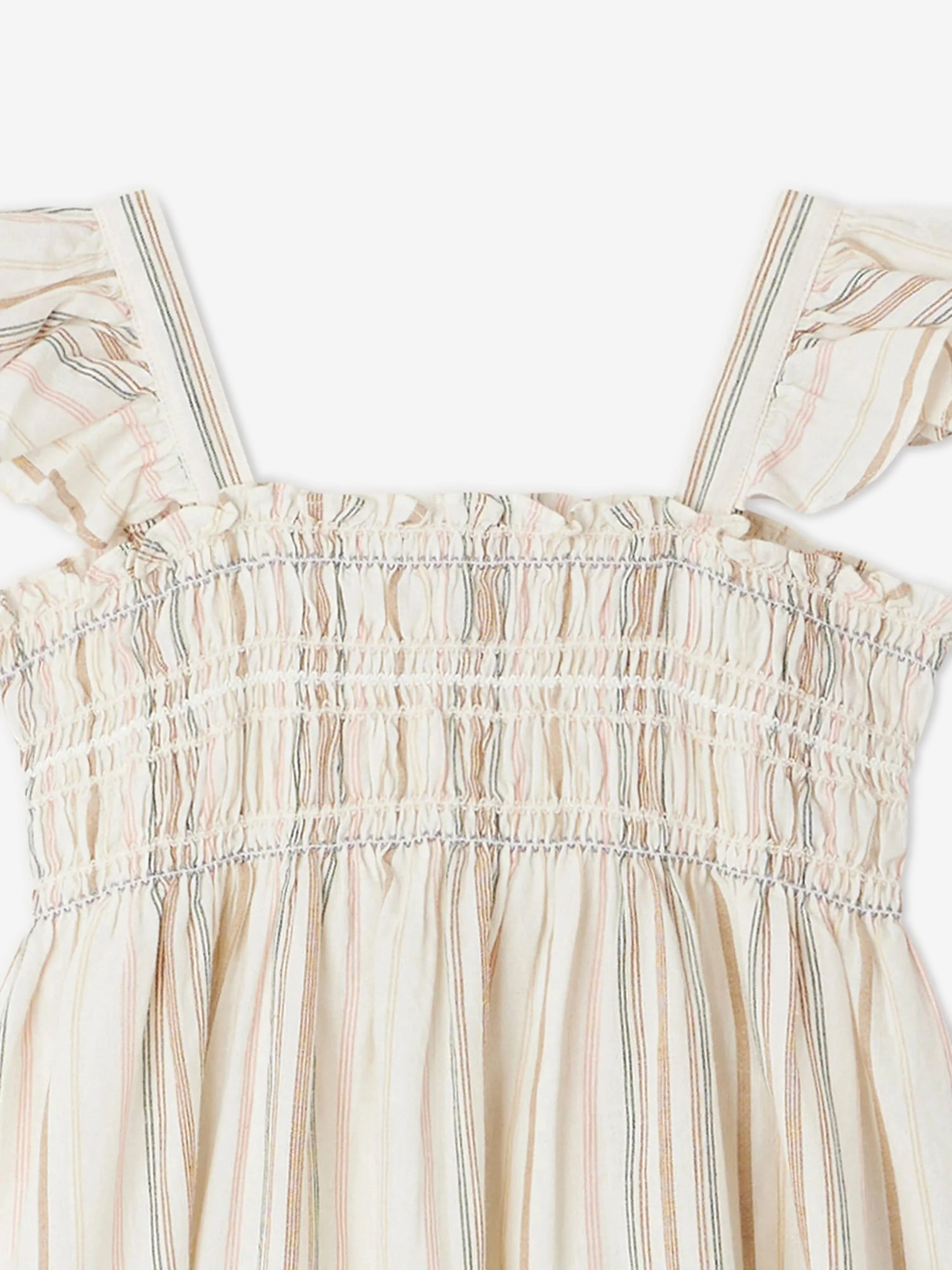 Bonpoint project French couture elements into their dainty portraits. This girls dress is reflective of the label's spellbinding quality and attention to detail. Crafted with an exquisite shirred bodice via intricate threading, multicoloured stripes and frill shoulder straps.